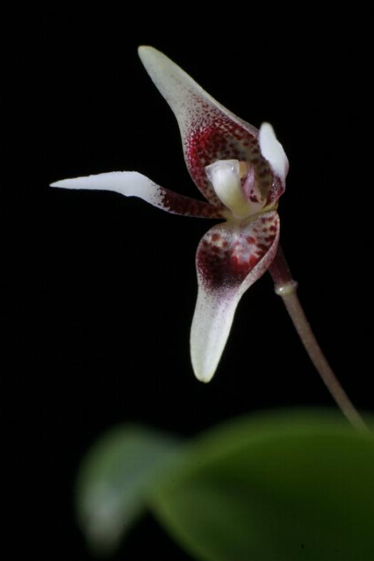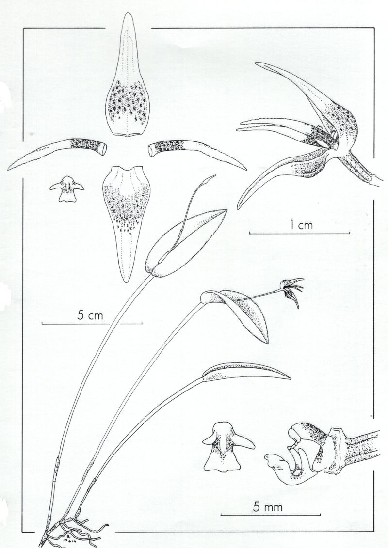 Found in Ecuador and Peru in cloud forests at elevations around 1450 meters as a small sized, cool growing epiphyte with slender, erect to suberect ramicauls enveloped basally by 2 to 3 sheaths and with a bract below the middle and carrying a single, rigid, coriaceous, ovate, acute leaf with the base narrowly cordate to obtuse that blooms on a fascile of sucessively single flowered, 2" [5 cm] long inflorescence arising from a reclining spathe.
