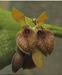 Found in Huanuco department Peru and La Paz department of Bolivia at elevations around 1200 meters as a small sized, cool growing epiphyte with ascending to erect, stout, more or less compressed and sulcate above ramicauls enveloped bya tubular sheath below the middle and 2 to 3 others at the base and carrying a single, apical, erect, thickly coriaceous, narrowly elliptical, subacute, cuneate below into the sessile base leaf that blooms in the fall on a congested, distichous, .6" [1.5 cm] long including the .2" [5 mm] long peduncle, simultaneously 2 to 4 flowered inflorescencebourne at the base of the leaf with a thin minutely pubescent floral bract.