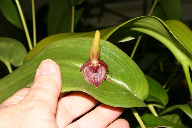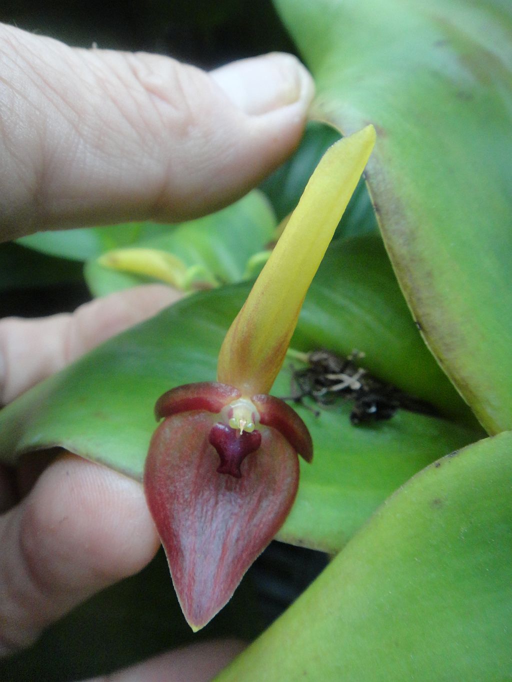 Found in Santander Colombia at elevations of 2000 as a miniature sized, cool to cold growing epiphyte with stout, erect ramicauls enveloped basally by 2 tubular sheaths and another below the middle and carrying a single, apical, erect, coriaceous, oblong-ovate, acute, attenuate, basally sessile and deeply cordate leaf that blooms in the winter on a short, successively single flowered inflorescence arising from a reclining spathe from the base of the leaf..