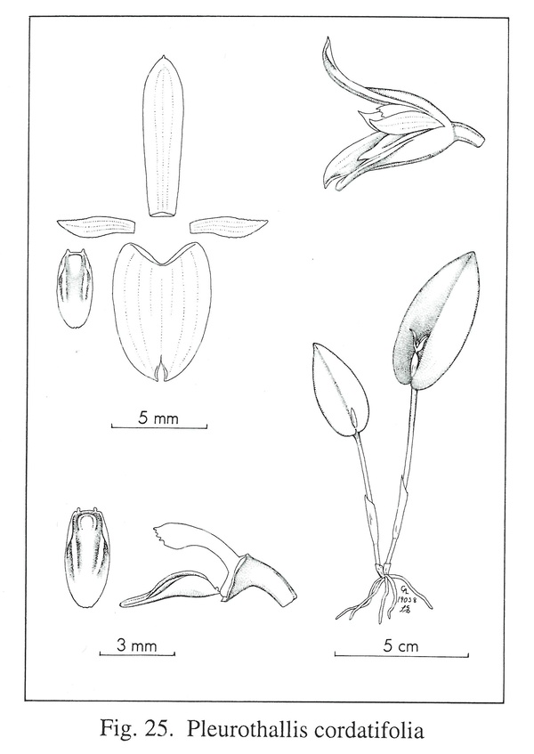 Pleurothallis cordatifolia Dod 1976 SUBGENUS Acianthera SECTION Sicariae SUBSECTION Sicariae Luer 1986 Drawing by Carl Luer and The Swiss Orchid Foundation at the Jany Renz Herbaria Website