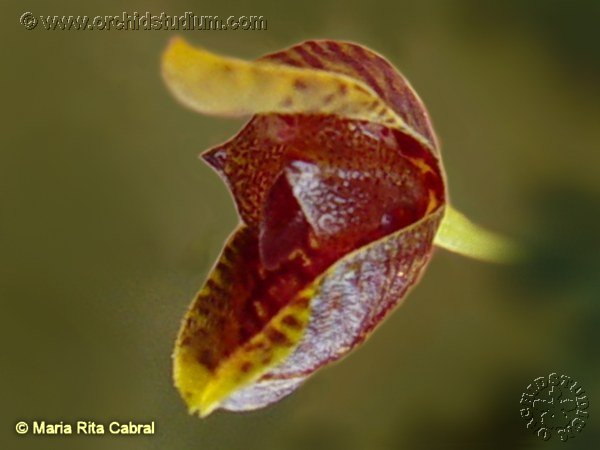 Found in Espirito Santo state of Brazil in humid cloud forests at elevations around 1500 meters as a mini-miniature sized, cool growing epiphyte with erect ramicauls enveloped by 2 tubular sheaths and carrying a single, apical, erect, coriaceous, light green, narrowly lanceolate, conduplicate, attenuate below into the subpetiolate base leaf that blooms in the fall on a 1.2" [3 cm] long, successively single to 5 flowered inflorescence arising through a spathe