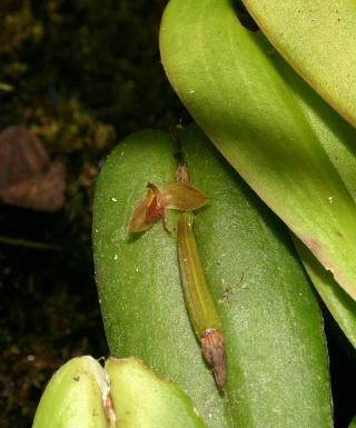 Found in Colombia Ecuador and Peru in cloud forests at elevations of 1200 to 3800 meters as a medium to large sized, cool to cold growing epiphyte with slender to stout, erect ramicauls enveloped basally by 2 close tubular sheaths and another on the lower third and carrying a single, apical, suberect to spreading, coriaceous, ovate to narrowly ovate, acute, lightly acuminate, basally sessile and deeply cordate leaf that blooms in the spring and summer on sometimes several, fascile of short, successive, singler flowered infloresence arising from the apex of the ramicaul through a spathe and carries tubular floral bracts.