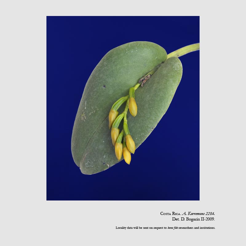 Found in Costa Rica at elevations around 1500 meters on moss covered treees as a small sized, warm to cool growing, shortly repent epiphyte with erect, compressed, triquetrous ramicauls enveloped by 2 to 3, thin, tubular sheaths and carrying a single, apical, erect to suberect, rigidly coriaceous, ovate, subacute, cordate and rounded intothe sessile base leaf that blooms in the spring on congested, distichous, [2.5 to 3 cm] long, simultaneously few to several flowered inflorescence arising through a spathe at the base of the leaf.