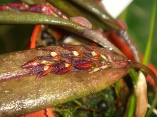 Found in Morona-Santiago province of Ecuador at elevations around 800 meters as a small sized, warm growing epiphyte with pendant ramicauls enveloped basally by 2 to 3, inflated, imbricating, acuminate sheaths and carrying a single, apical, pendant, elliptical, acute, rounded below into the sessile base leaf that blooms in the spring on a pendant, 1.6" [4 cm] long, few to 7, simultaneously flowered inflorescence arising through an annulus.