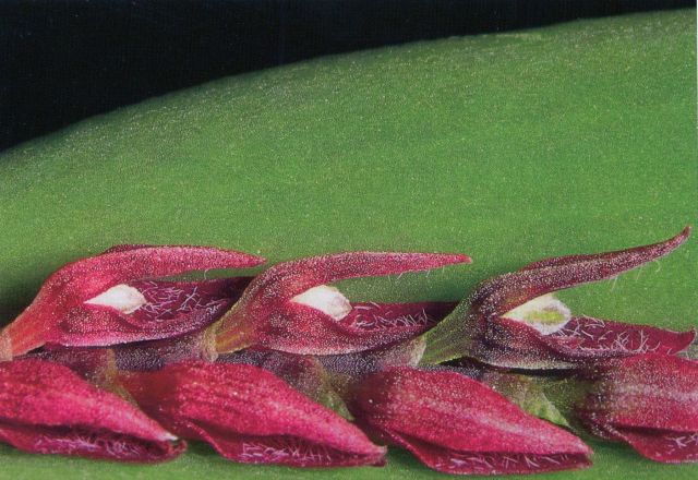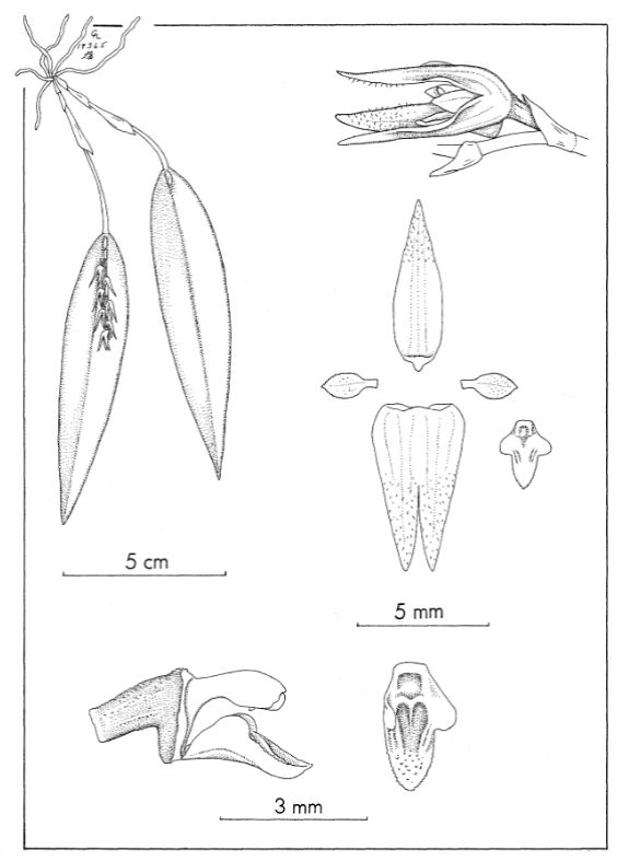 "This species, known only from the original collection, is apparently rare and endemic in southeastern Ecuador. It is characterized by the pendent habit with the ramicaul, clad with a loose sheath that is shorter than the narrowly ovate leaf. The raceme is congested and simultaneously flowered, about half the length of the leaf. The sepals are fleshy carinate, narrow and acute; the petals are minutely denticulate; and the lip is three-lobed with the lobes erect, below the middle and rounded. The base of the lip is concave above a transverse callus." Luer 2001
