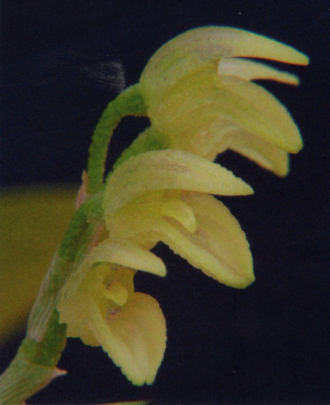 Found in Chiriqui department of Panama at elevations around 1700 meters as a miniature to small sized, cool growing epiphyte with a erect, terete ramicaul enveloped by 4 to 6 loose, ribbed tubular sheaths and carrying a single, apical, erect, coriaceous, elliptical, subacute to acute, cuneate below into the petiolate base leaf that blooms in the late fall and early winter on a verrucose, .2" [5 mm] long, 2 to 5 flowered inflorescence arising from a node below the abscission layer