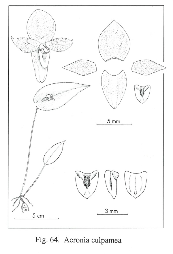 Photos by S Manning/ TYPE Drawing of Acronia culpameae by Carl Luer and The Swiss Orchid Foundation at the Jany Renz Herbaria Website