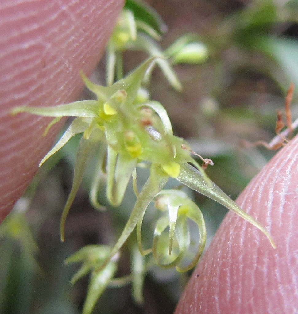 Found in Sao Paulo state of Brazil in primary forests on mossy tree trunks in shade and moderate humidity and good air circulation at elevations of 900 to 1600 meters as a mini-miniature sized, cool growing epiphyte with erect ramicauls enveloped by 2 to 3 basal sheaths and carrying a single, apical, fleshy, oval, pointed, dark green, unkeeled leaf that blooms in the later spring on a hair-like, .8" [2 cm] long, 3 to 4 flowered inflorescence.