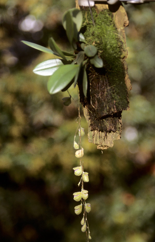 Found in the Dominican Republic as a mini-miniature sized epiphyte with stout, slender ramicauls enveloped by 2 to 3, thin, tubular sheaths and carrying a single, apical, erect, thickly coriaceous, elliptical, subacute to obtuse, denticulate-erose margins, cuneate below into the subpetiolate base leaf that blooms in the late fall and early winter on an erect, .1 to .12" [2 to 3 mm] long, single flowered inflorescence with an oblique floral bract.