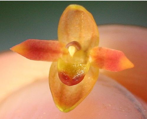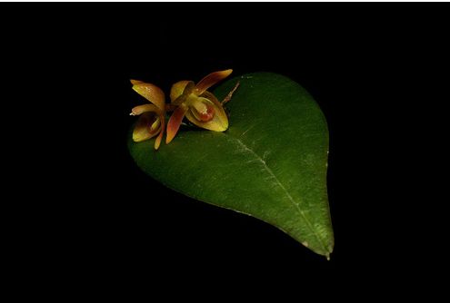 Found in Ecuador at elevations of 1500 to 2300 meters as a warm to cool growing epiphyte with slender, erect, compressed above the middle ramicauls with a tubular sheath below the middle and 2 to 3 others at the base and carrying a single, apical, erect, coriaceous, erect to spreading, ovate, acute, sessile, rounded and subcordate base leaf that blooms in the spring on a slender, suberect, .2 to .25" [5 to 7 mm] long, fascile of successively single flowered inflorescence arising through a reclining spathe at the base of the leaf and has a thin floral bract
