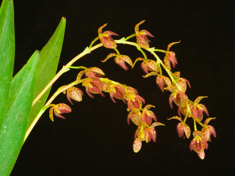 Found in Zamora Chinchipe Ecuador at elevations around 1400 meters as a miniature to just small sized, warm to cool growing epiphyte with slender, erect ramicauls with a tubular sheath below the middle and 2 to 3 others at the base and carrying a single, erect, thinly coriaceous, elliptical, acute, cuneate below into the petiolate base leaf that blooms in the late fall on a weak, slender, more or less arcuate to drooping, 3.4" [8.5 cm] long, simultaneously several flowered inflorescence arising from a 1.6" [4 cm] long, spathe at the base of the leaf with an oblique, infundibular, acute floral bract.