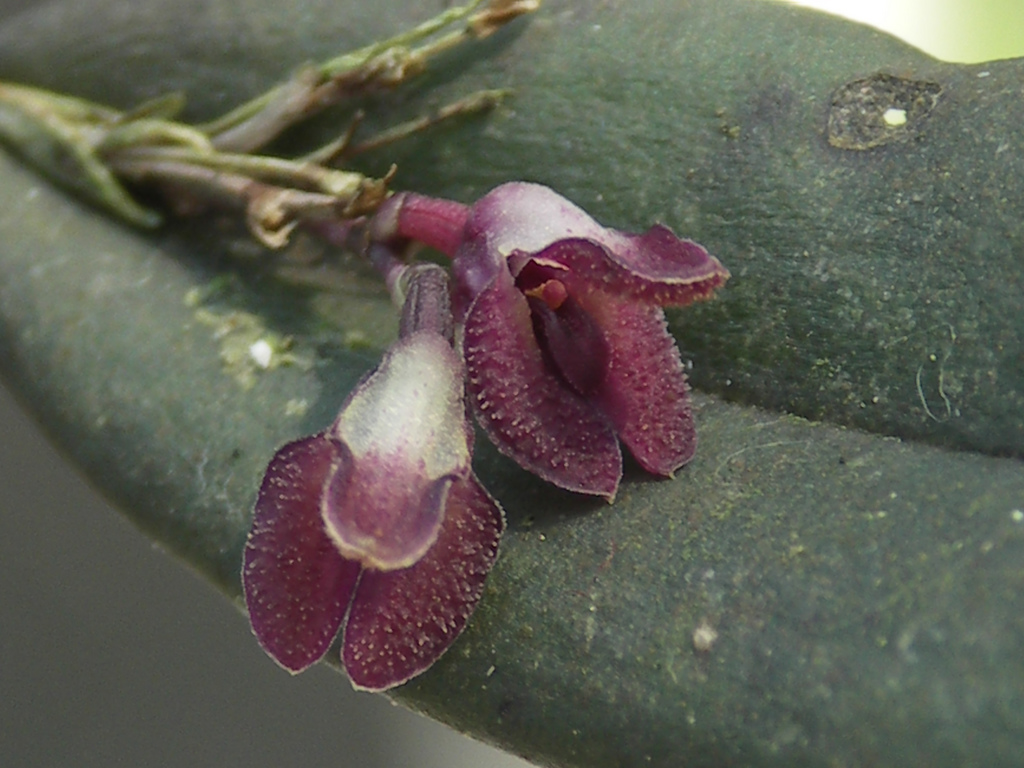 Found from Costa Rica, Panama, Ecuador and Venezuela as a miniature to small sized, hot, pendulous growing epiphyte that occurs at elevations of 300 to 2000 meters with an erect, ramicaul enveloped basally by 2 to 3 tubular sheaths and carrying a single, apical, narrowly lanceolate leaf that blooms on a short, apical, few flowered, fasciculate inflorescence that has the flowers held close to the base of the leaf.