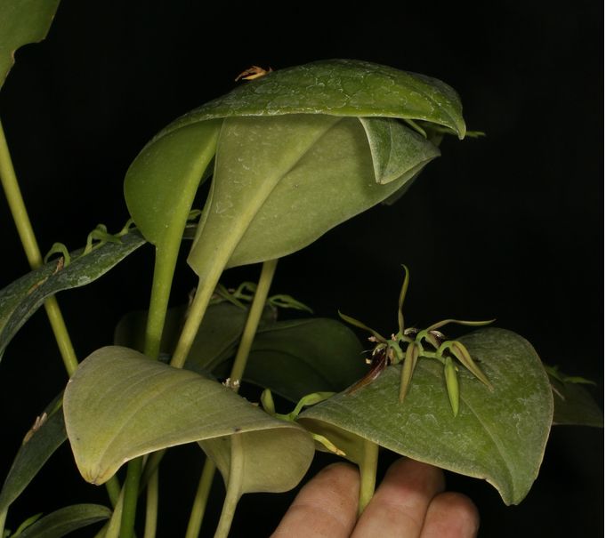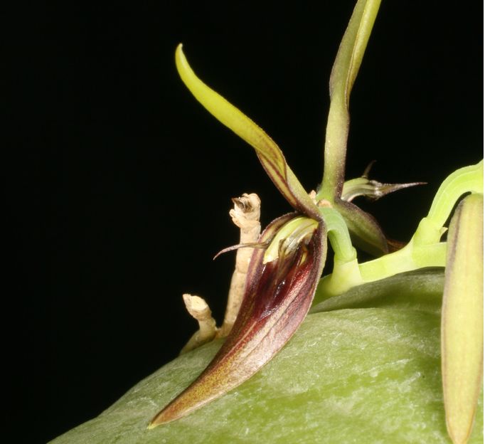 Found in Colombia, Peru and Ecuador in wet montane forests at elevations of 1150 to 2800 meters as a to small sized, cool to cold growing epiphyte with elongate, slender, terete, stiff pseudobulbs enveloped basally by 2 tubular, scarious sheaths, with a single, apical, elliptic, subamplexicaule, acuminate, coriaceous, dark green leaf that blooms in the winter on a fascile of short [to 3 cm], racemose, few [2 to 4] flowered inflorescence arising from a small spathe, and lays laxly upon the upper leaf surface.