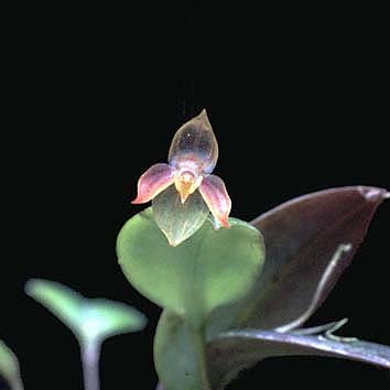 Found in Esmeraldas Ecuador at elevations around 750 meters as a mini-miniature sized, hot to warm growing epiphyte with slender, erect, terete ramicauls with a few close, tubular sheaths and carrying a single, apical, spreading, coriaceous, ovate, acute, shortly acuminate, basally cordate and sessile leaf that blooms in the winter on a suberect, .6 to .8" [1.6 to 2 cm] long, fascile of successively single flowered inflorescence arising through a spathe at the base of the leaf.