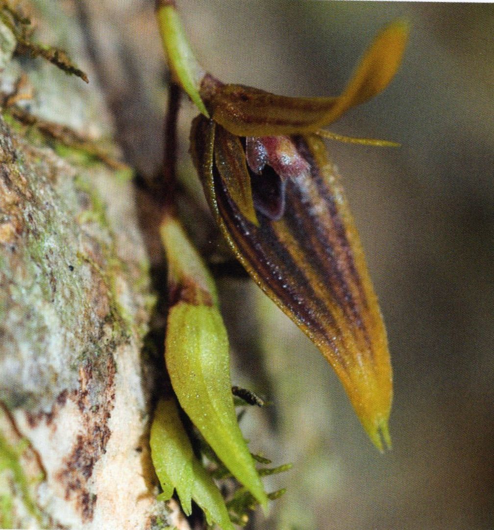Found in Cuba in Barill forests at elevations of 900 to 1500 meters as a mini-miniature sized, warm to cool growing epiphyte low to the ground in humid, deep shade with a straight, ascending to pendent ramicauls enveloped by 2, scarious, conduplicate, carinate sheaths and carrying a single, apical, erect, coriaceous, ovate to narrowly elliptic, distinctly carinateacute, tridentate, green, slightly rough above and glabrous beneath, denticualte margins, revolute, shortly attenuate below into the base leaf that blooms in the late spring and early summer on 1 to 10, terminal, 1.2 to 2" [3 to 5 cm] long, pendent, somewhat flexuous, racmose, successively 1 to 2, 2 to 10 flowered inflorescence arising through an acute, ovate spathe and with tubular, acute, inflated floral bracts.