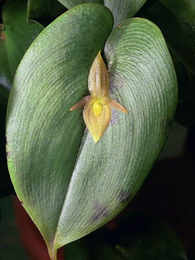 Found in Choco' Colombia at elevations around 1800 meters as a miniature sized, warm to cool growing epiphyte with slender, erect, ramicauls enveloped basally by 2 to 3 slender, tubular sheaths and another below the middle and carrying a single, apical, spreading, coriaceous, broadly cordate, obtuse, shortly acuminate, basally sessile leaf that blooms in the spring on a successively single flowered inflorescence arising through a reclining spathe and a thin floral bract and with the flower widely spread and apressed to the surface of the leaf.