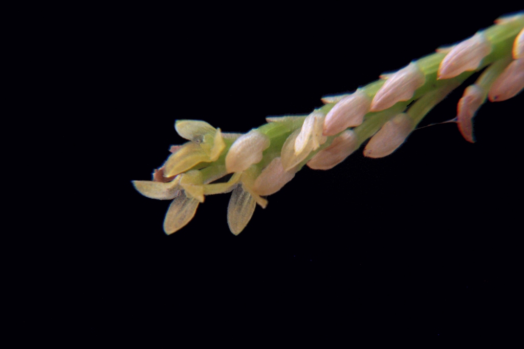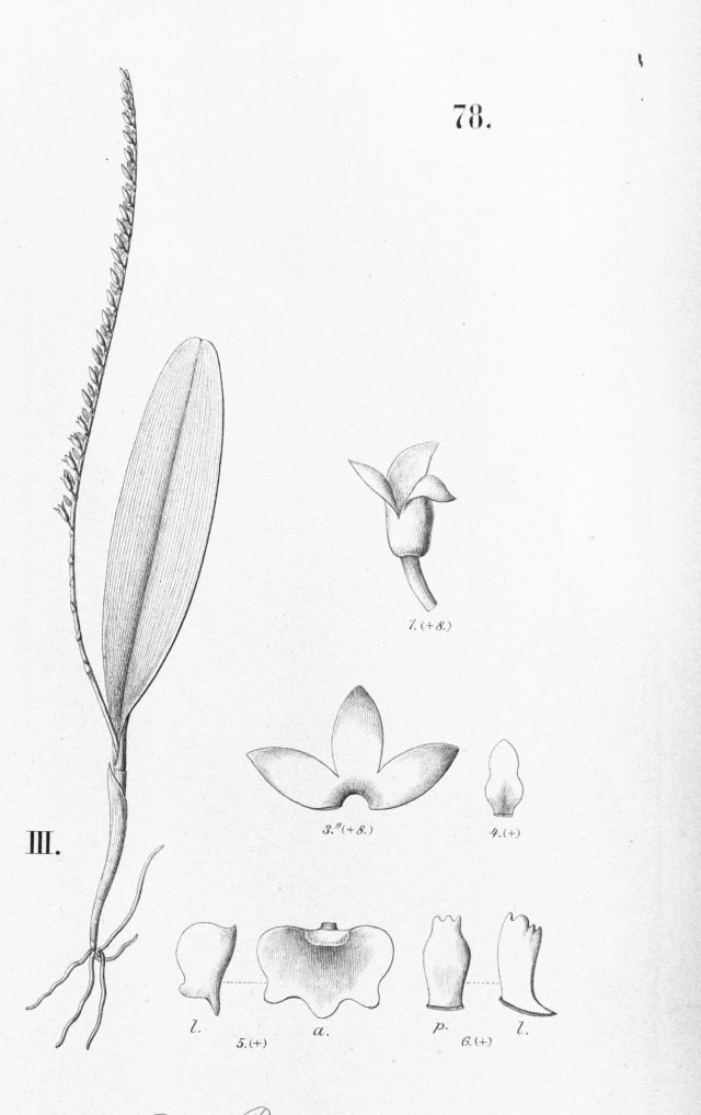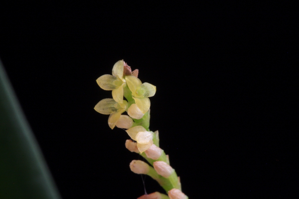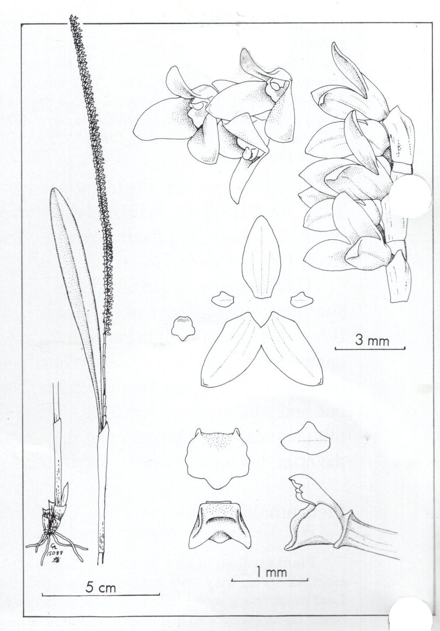 Found from Belize, Honduras, Costa Rica, Panama and then Ecuador, Peru and Brazil in lowland forests at elevations of 100 to 1900 meters as a small to medium sized, densly caespitose, hot to warm growing epiphytic herb with clustered ramicauls enveloped basally by 2 to 4 tubular sheaths and carrying a single, apical, coriaceous to subcoriaceous, erect to patent, variable, lanceolate, oblong, elliptic, oblanceolate-ligulate, to ovate, obtuse to rounded apically, from almost sessile to cuneate to longly attenuate and petiolate base leaf that blooms on 1 to several apical, distichous to subsecund, densly and simultaneously many tiny flowered racemes that are much longer than the leaf, that occurs in the summer and fall.