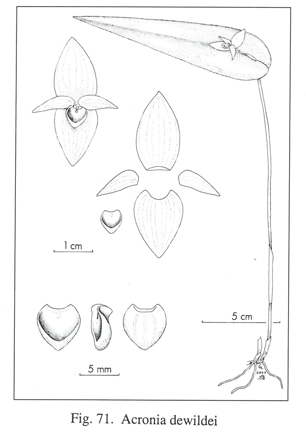 References W3 Tropicos, Kew Monocot list , IPNI ; *Orquideologia Vol. 21 No 1 Dodson 1998 drawing fide; Icones Pleurothallidinarum Vol XXVII Luer 2005 as Acronia dewildei drawing fide; Lankesteriana Vol 18 [2]: Jimenez, Baquero, Wilson & Iturralde 2018 photo fide