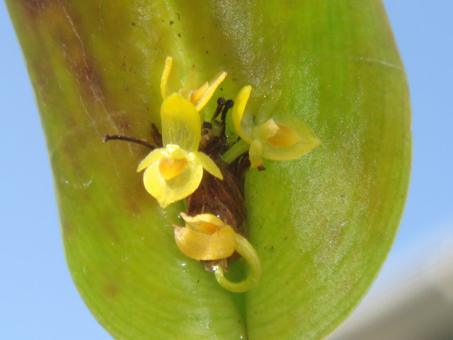 Found in Ecuador at elevations around 500 to 1300 meters as a small sized, warm to cool growing epiphyte with slender, erect ramcauls with a close tubular sheath below the middle and 2 others at the base and carrying a single, apical, spreading, coriaceous, narrowly ovate, acute, with the sides more or less revolute, and narrows abruptly to the sessile, shallowly cordate base leaf that blooms in the spring and summer on a fascile of successive, single flowered inflroecence subtended by a spathe and has the opeduncle concealed within and has thin, tubular floral bracts.