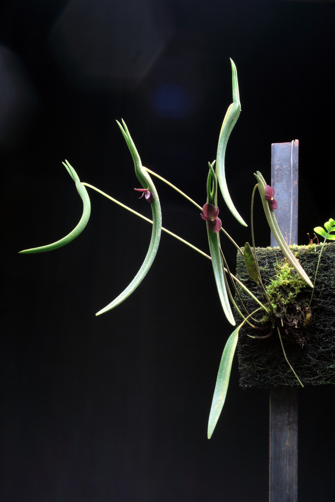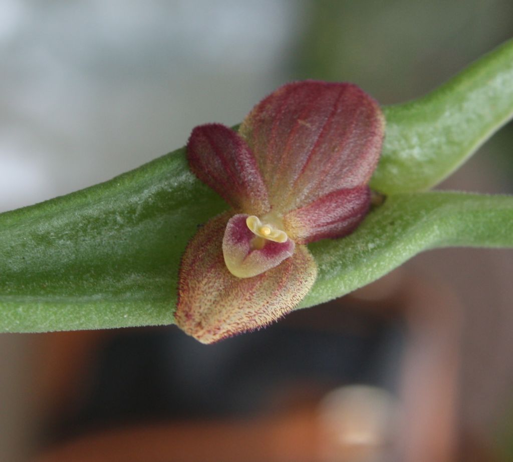 This one has flowers that are undistinctive in the section but vegetatively this one is unique with mature plants. The very rigid leaves are very three dimensional because they are thickly, acutely defexed away from the ramicaul and are very narrowly cordate basally becoming almost horn-like above the flower nestled at the base below and overall the leaves hang like pea pods.