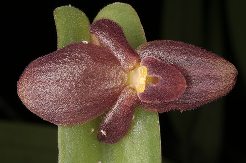 Found in Ecuador at elevations of 1800 to 2000 meters as a small sized, cool growing epiphyte with slender, erect, ramicauls enveloped basally by 2 close, tubular sheath and another on the lower half and carrying a single, apical, deflexed, thickly rigid, semi-terete, narrowly ovate to sigmoid-ovate, densely short-pubescent, broadly and shallowly channeled to near the apex, acute, basally sessile, deeply forked with semiterete basal lobes, pointing upwards leaf that blooms in the fall on a successive single flowered inflorescence arising through a reclining spathe at the leaf base.
