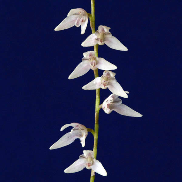 Found in Colombia, Venezuela, Peru and Bolivia at elevations of 2100 to 2800 meters as a mini-miniature sized, cold growing epiphyte with blackish, erect, slender ramicauls with a tubular sheath near the middle and 2 to 3 others at the base and carrying a single, apical, ercet, thickly coriaceous, narrowly elliptical, subacute to obtuse, narrowly cuneate below into the petiolate base leaf that blooms in the later summer and fall on a loose, subsecund, 1.6 to 3.2" [4 to 8 cm] long, simultaneously several flowered, racemose inflorescence arising through a spathe with an annulus
