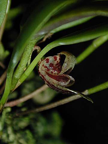 Found in Ecuador at elevations of 2400 to 2450 meters as a mini-miniature sized, cool to cold growing epiphyte with slender, erect ramicauls enveloped by a long tubular sheath and 2 t o3 others at the abse and carrying a single, apcial, erect, coriaceous, elliptical, subacute to obtuse, cuneate below into the petiollate base leaf that blooms in the fall on a fascile of .2" [5 mm] long, successively single flowered inflorescence arising through a narrow spathe at the apex of the ramicaul