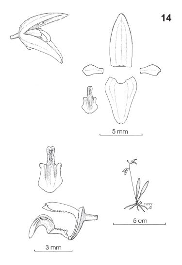 Found in Espirito Santo state of Brazil as a mini-miniature sized, warm growing, caespitose epiphyte with slender, erect, ramicauls enveloped by 2 thin, tubular sheaths and carrying a single, apical, erect, thickly coriaceous, narrowly elliptical, acute, narrowing below into the subpetiolate base leaf that blooms on an erect, borne from near the apex of the ramicaul, peduncle 1 to 1.2" [2.5 to 3 cm] long, 1.2 to 1.6" [3 to 4 cm] long overall, loose, 2 to 4 flowered inflorescence with as long as to shorter than the pedicels floral bracts.