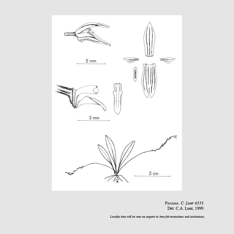 References W3 Tropicos, Kew Monocot list , IPNI ; *Icones Pleurothallidinarum Vol XVIII Systematics of Pleurothallis subsection Antenniferae, Longiracemosae, Macrophyllae-Racemosae and Subgenera Pseudsostelis and Acuminata Luer 1999 drawing fide; Orquideologia Vol 21 #3 2000 drawing fide;