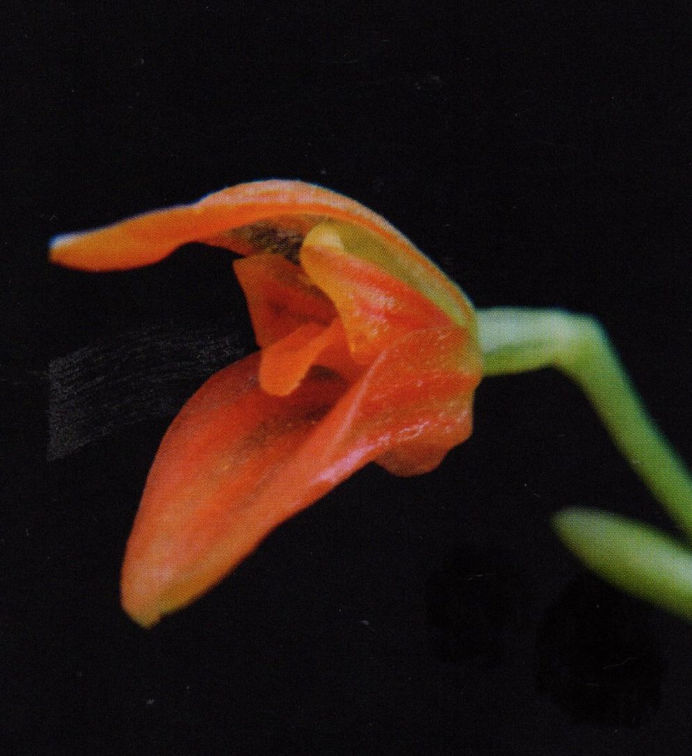 Found in Panama at elevations around 1000 meters as a mini-miniature sized, warm to cool growing epiphyte with erect, slender ramicauls enveloped by 2, thin tubular sheaths and carrying a single, apical, erect, coriaceous, narrowly elliptical, acute, gradually narrowing below into the indistinct, subpetiolate base leaf that blooms in the fall on a hoizontal to spreading, to 4.8" [12 cm] long, subcongested to lax, disheveled, successively many flowered inflorescence arising laterally from the ramicaul and with thin, tubular floral bracts.