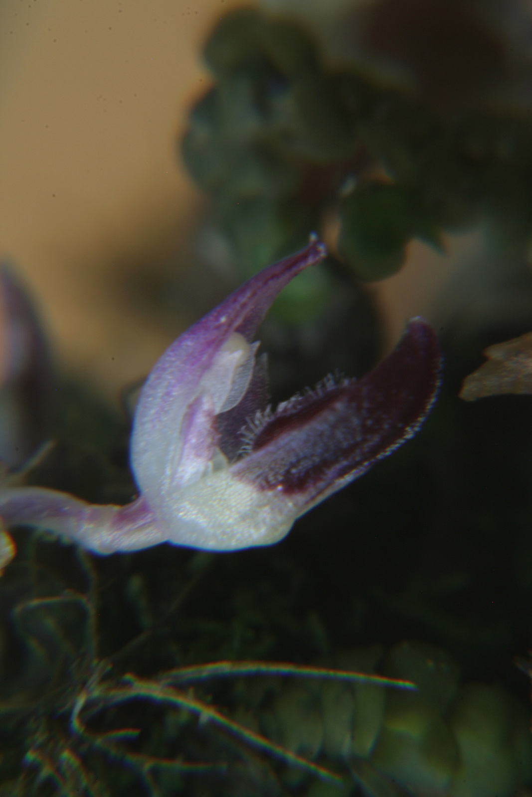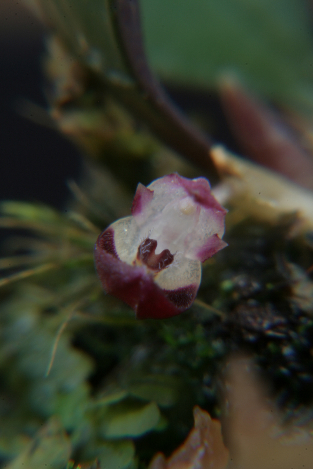 Found in the Dominican Republic at elevations of 900 to 1300 meters as a mini-miniature sized, warm to cool growing epiphyte with slender, erect ramicauls enveloped by 2 thin, loose, tubular sheaths and carrying a single, erect, purple, coriaceous, minutely denticulate, elliptical, subacute to obtuse, cuneate below into the petiolate base leaf that blooms in the winter, spring and summer on an erect, .08" [2 mm] long, successively single, few flowered inflorescence arising from near the base of the ramiucal within the basal sheaths and has an infundibular floral bract.