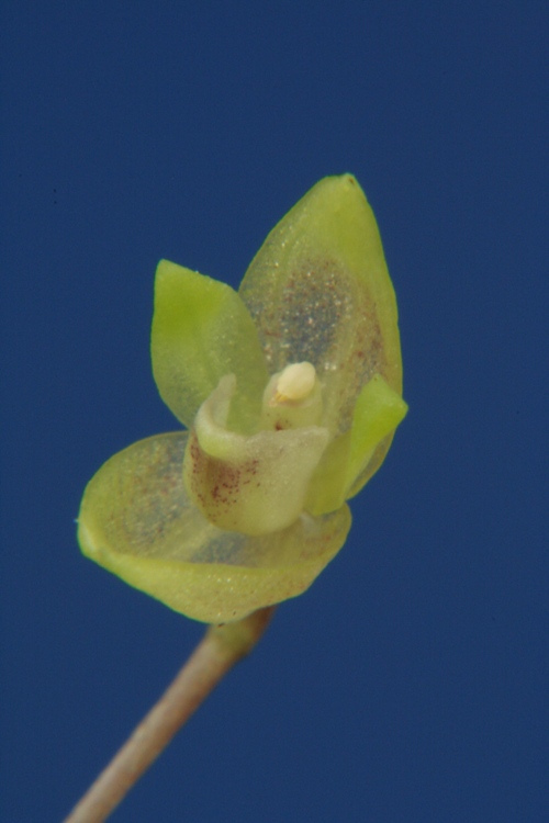 Found in Ecuador without locational data as a mini-miniature sized caespitose epiphyte with erect slender, compressed ramicauls enveloped by a tubular bract below the middle and 2 to 3 others at the base and carrying a single, apical, erect, coriaceous, narrowly ovate, acute, broadly cuneate below into the sessile base leaf that blooms in the spring on a solitary, .24 to .32" [6 to 8 mm] long, successive, few flowered inflorescence arising through a reclining spathe