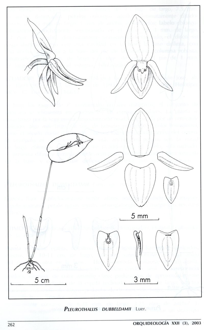 References W3 Tropicos, Kew Monocot list IPNI ; *Orquideologia Vol 22 #3 2003 Luer drawing fide; Icones Pleurothallidinarum Vol XXVII Luer 2005 drawing as Acronia dubbeldamii drawing fide