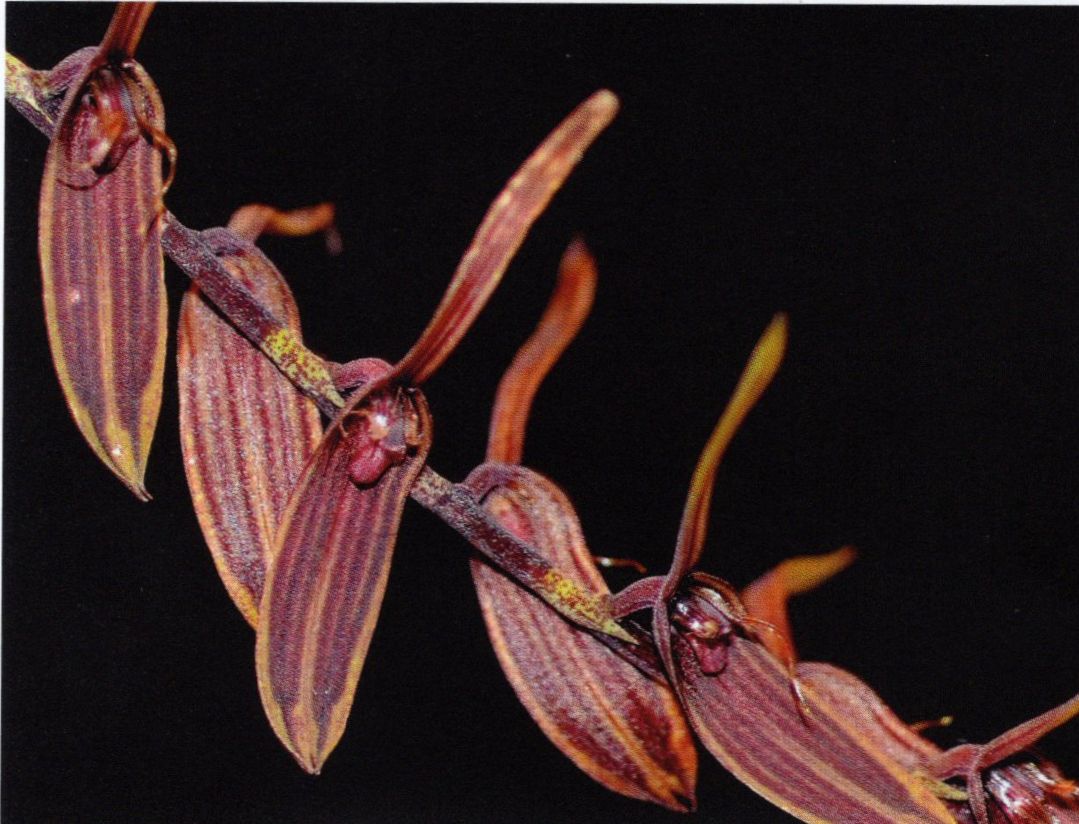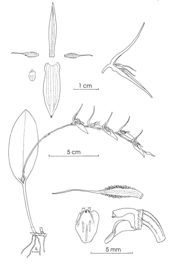 "This species, apparently from Colombia, is characterized by stout, erect ramicauls with thick, elliptical leaves, and a longer, drooping, loosely flowered raceme of purple flowers. The very narrow, two-centimeter-long dorsal sepal is directed 90 degrees from the synsepal and descending rachis. The filiform tips of the petals are as long as the fimbriate blade below, and the lip is thick and ovoid with erect, rounded margins below the middle." Luer & Sijm