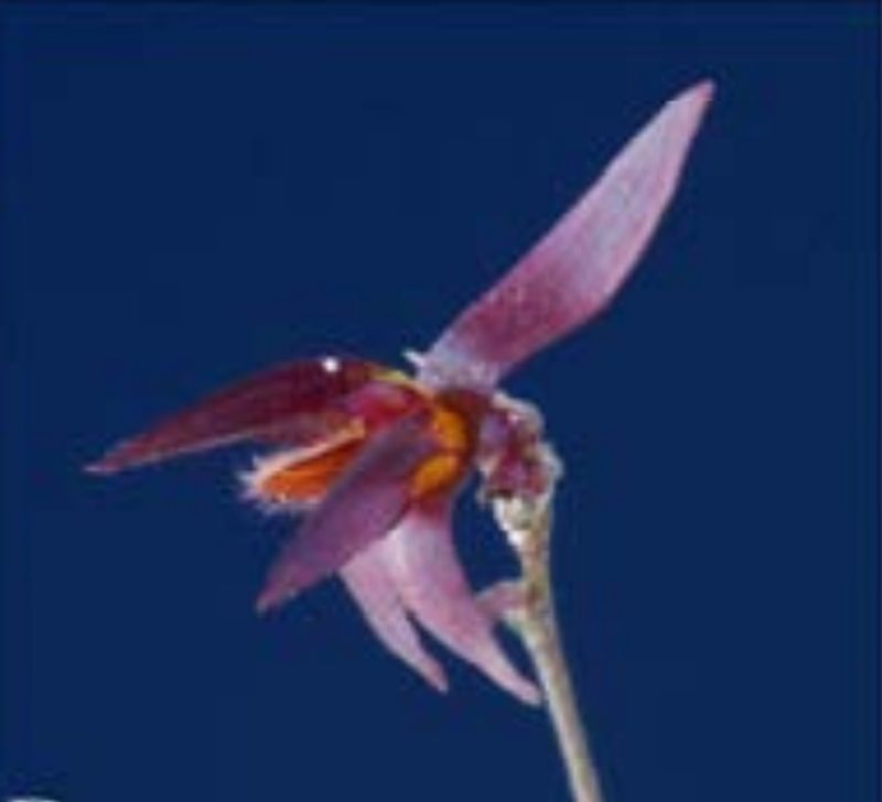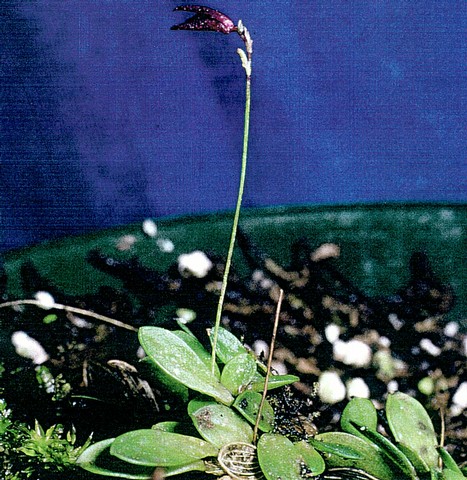 Found in Belize at elevations around 760 meters as a mini-miniature sized, warm growing epiphyte with erect ramicauls enveloped by 2, thin, tubular sheaths and carrying a single apical, suberect to prostrate, lens-shaped, elliptical, subacute to obtuse, cuneate below into the petiolate base leaf that blooms in the summer on a filiform, .8 to 1" [2 to 2.5 cm] long, subcongested, successively few flowered inflorescence arising laterally from the ramicaul.