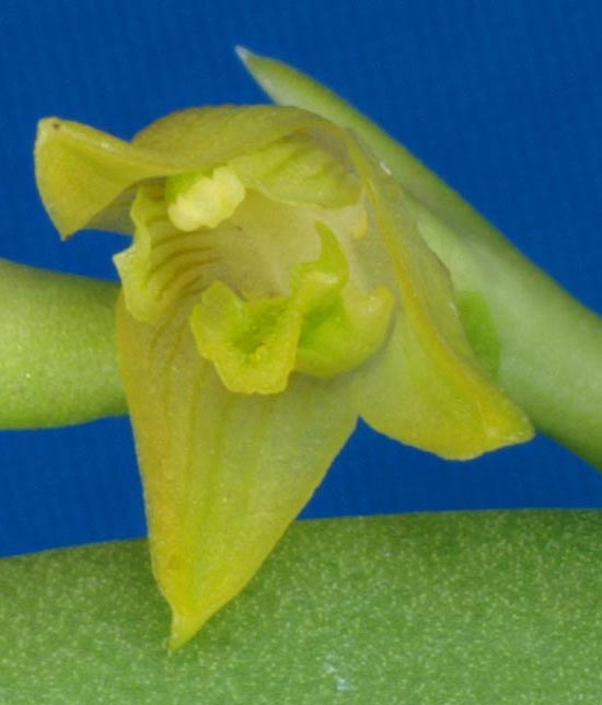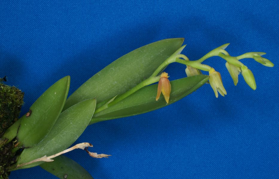 Found in Ecuador and Peru in dry montane woods at elevations of 1600 to 2150 meters as a mini-miniature sized, cool to cold growing epiphyte with stout, terete, erect ramicauls enveloped at the base by 2 to 3, thin, tubular sheaths and carrying a single, apical, erect, thickly coriaceous, elliptica, subacute to obtuse, cuneate below into the petiolate base leaf that blooms in the later fall and winter on a stout, 6.4" [16 cm] long, loose, disitchous, subflexuous, successively several flowered inflorescence arising through a small spathe and has oblique, acute, compressed floral bracts and a densely echinate ovary..
