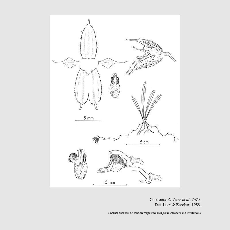 Found in Norte de Santander Colombia at elevations around 2300 meters as a mini-miniature sized, cold growing epiphyte with slender, erect ramicauls with 2 thin, tubular sheaths and carrying a single, erect, coriaceous, narrowly obovate, subacute to obtuse, narrowly cuneate below into the indistinct petiolate base leaf that blooms in the later spring on a horizontal, to 2.8" [7 cm] long including the .4 to .8" [1 to 2 cm] long peduncle, more or less creeping, loose, flexuous, successively single, several flowered inflorescence arising laterally from the ramicaul.