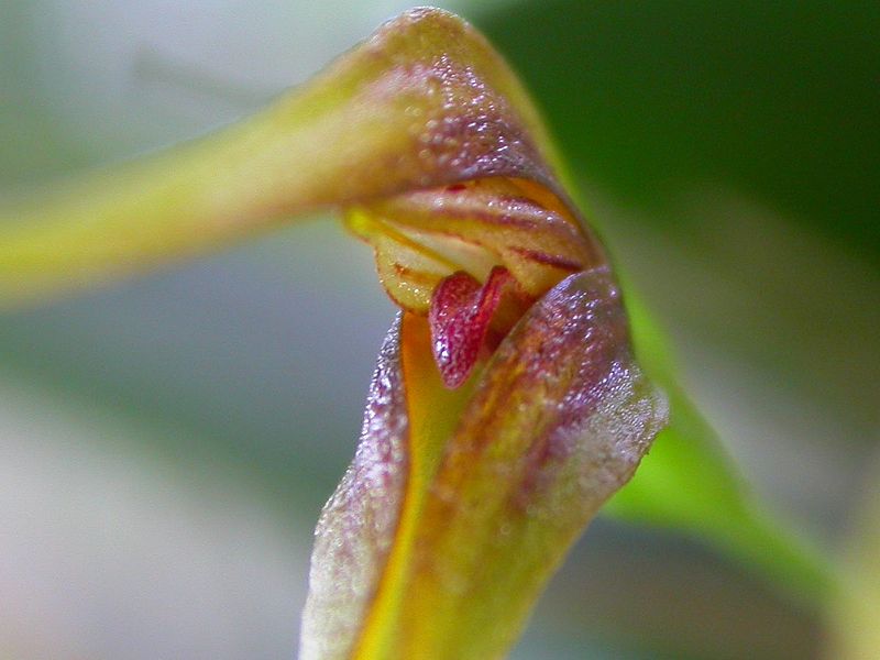 Found in French Guinea, Surinam, Brazil and Bolivia in foothills as a miniature sized, warm to cool growing epiphyte with erect ramicauls enveloped by 1 to 2 tubular, acuminate sheaths and carrying a single, apical, erect, coriaceous, narrowly elliptical, acute, gradually narrowing below into the elongate petiolate base leaf that blooms in the fall on an erect, to 1.2" [3 cm] long, fractiflex successively single flowered inflorescence.