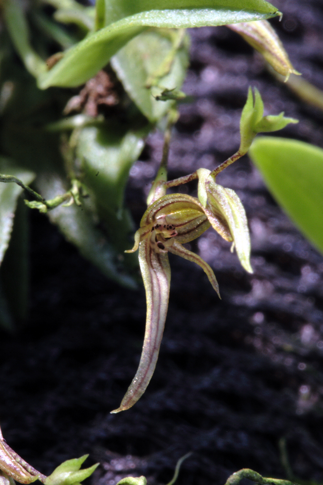 Found in the Dominican Republic and Haiti at elevations around 1000 to 1500 meters as a mini-miniature sized, cool growing epiphyte with slender ramicauls enveloped by 3 tubular sheaths with the uppermost longest and carrying a single, erect in relation tothe ramicaul, coriaceous, minutely crenulate margined, elliptical, acute, cuneate below into the sessile base leaf that blooms in the fall, winter and spring on a loose, flexuous, disitchous, 1.2 to 1.8" [3 to 4.5 cm] long including the .6 to .8" [1.5 to 2 cm] long slender peduncle, simultaneously few flowered inflorescence arising through a spatrheat the leaf base and has oblique, dilated floral bracts.
