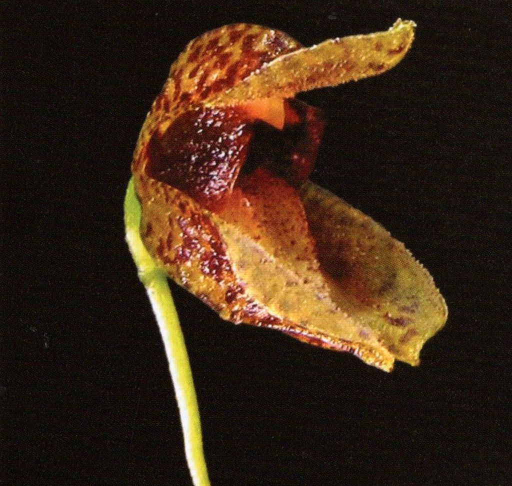 Found in Bahia state of Brazil in the Atlantic rain forest at elevations around 180 meters as a mini-miniature sized, hot growing epiphyte with an inconspicuous rhizome giving rise to terete ramicauls provided with 2 to 3, scaly deciduous sheaths and carrying a single, green, erect, subcoriaceous, evident rib on the back, slightly recurved, lanceolate, tridentate apically, attenuate in the lower third, gradually narrowing below into the petolaite base leaf that blooms in the late winter and early spring on a terminal, arising through a small spathe, peduncle cylindric, arched, longer than the leaf, to 6" [15 cm] long, flexuous, zig-zag, successively single, few flowered inflorscence with triangular, acute floral bracts and carrying outwardly glabrous flowers.
