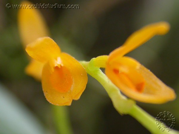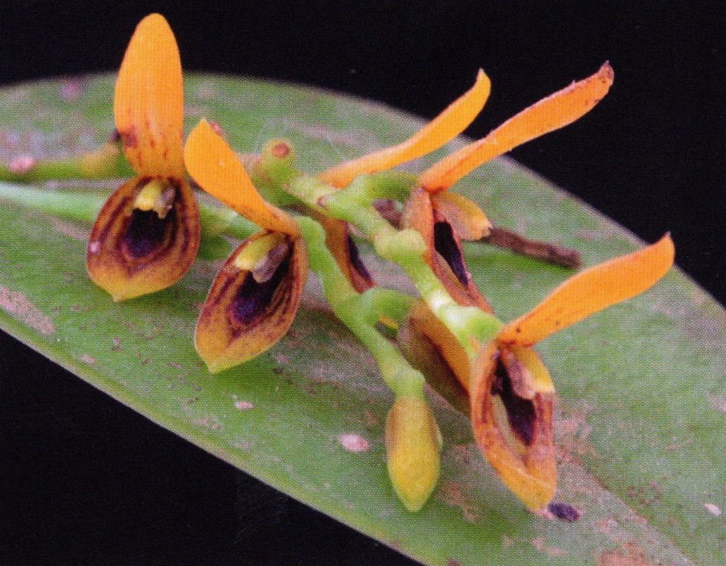 Found in eastern and southern Brazil at elevations of 700 to 800 meters as a mini-miniature, hot to warm growing epipyhte with an erect, thicker towards the apex ramicaul carrying a single, apical, erect, coriaceous, ovate,slightly recurved apex, slightly infolded, fleshy stiff, conduplicate, grass-green to yellow in bright light leaves that blooms in the late spring and early summer on 1 to 2, erect, 1" [2.5 cm] long, to 5 flowered inflorescence arising through a spathe with the flower held close to the leaf base.