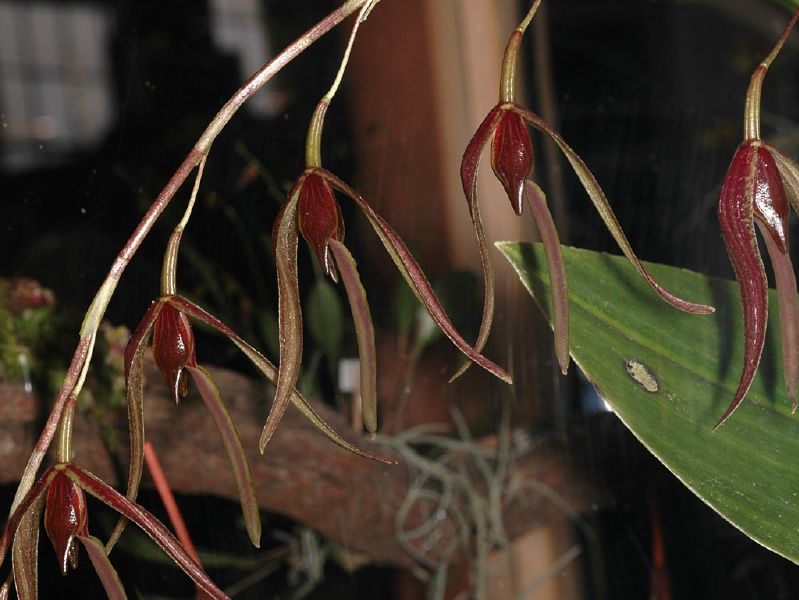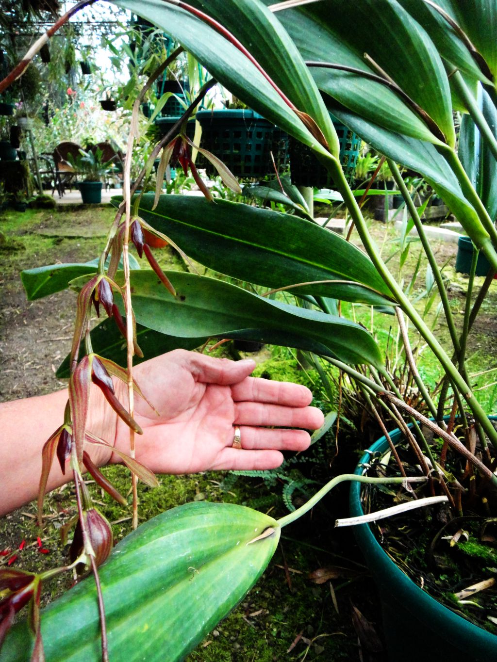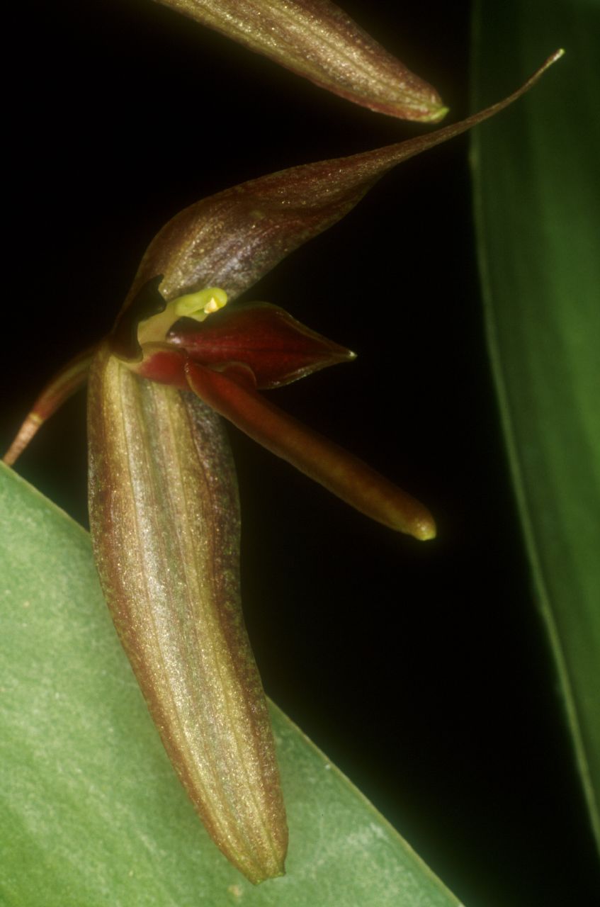 Found in Colombia and Ecuador in virgin forests at elevations around 1600 to 1900 meters as a large sized, cool growing epiphyte or terrestrial in rich shaded humus with stout, erect ramicauls enveloped basally by a purple spotted, tubular sheath below the middle and 2 at the base carrying an apical, single, erect, thickly coriaceous, elliptical-ovate, subacute, sessile, gradually narrowing below into he cuneate base leaf that blooms in the winter and spring on a suberect to arching, loose, subsecund, 20 to 24" [50 to 60 cm] long, simultaneously several flowered, racemose inflorescence arising through a basal spathe and has infundibular, acute floral bracts.