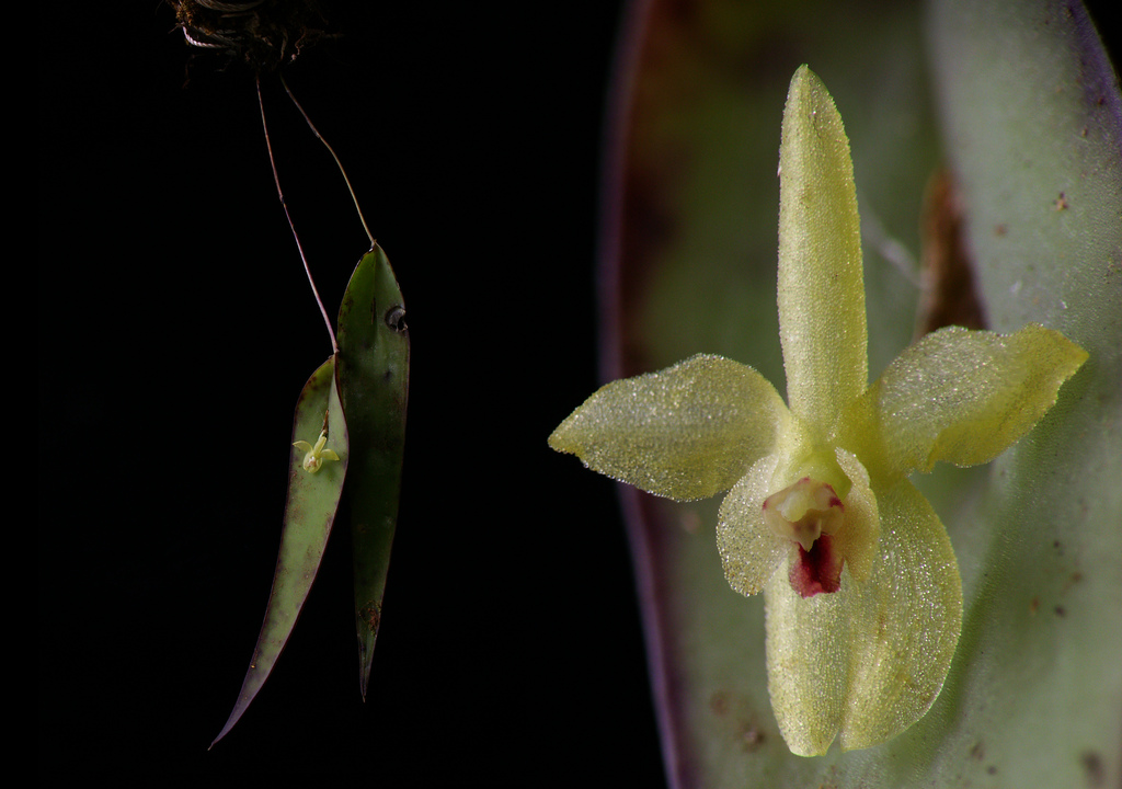 Found in Cartago, Puntarenas and San Jose provinces of Costa Rica at elevations 950 to 1400 meters as a small to medium sized, warm to cool growing epiphyte with descending, horizontal, slightly compressed above ramciaul enveloped below the middle by a closely adpressed, tubular sheath and another 2 at the base and carrying a single, apical, spreading, pendent, coriaceous, narrowly ovate, acute, more or less incurved sides, concave at the subcordate to cuneate base leaf witht he margins decurrent on the ramicaul for about .8" [2 cm] that blooms in the summer ona successive single flowered inflorescence arising through a spathe and has thin, tubualr floral bracts.