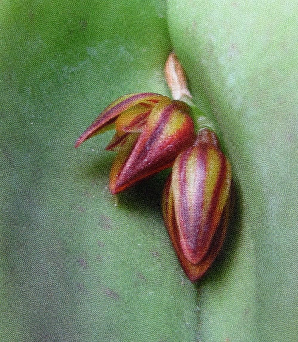 Found in Espirito Santo Brazil on rocks in full sun as a small sized, warm to cool growing rupicolus orchid with erect, ramicauls enveloped below by 2 to 3, tubular sheaths and carrying a single, apical, horizontal to descending, yellow green, conduplicate, elliptical, acute, cordate below into the elongate petiolate base leaf that blooms in the spring on a descending, [1.5 to 2.5 cm] long, 3 to 4 flowered inflorecsnce with a tubular, yellow green floral bract .