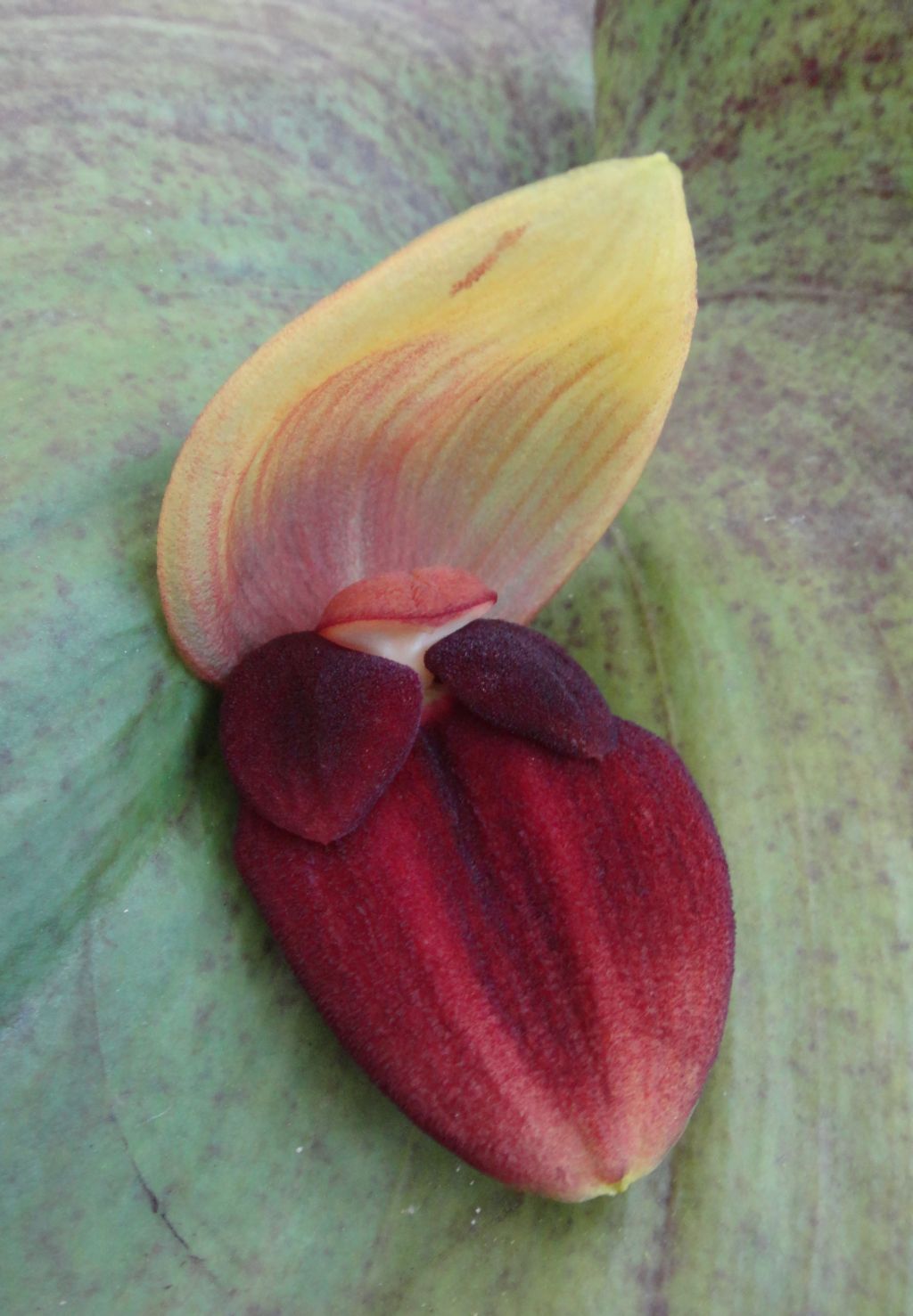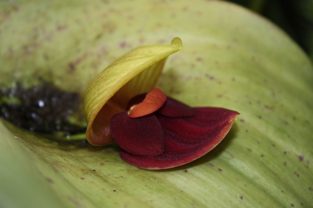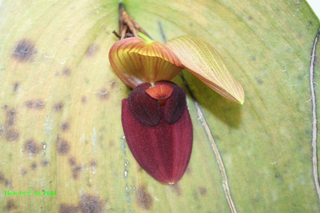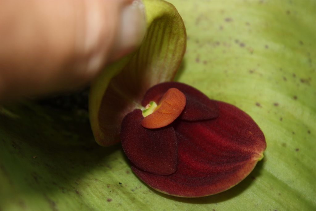Found in Ecuador as a large sized, warm to cool growing terrestrial orchid on steep forests at elevations around 1500 to 2500 meters with stout, erect ramicauls enveloped by 3 to 4 tubular sheaths and another below the middle and carrying a single, apical, spreading, coriaceous, broadly ovate, acute, basally sessile and deeply cordate leaf that blooms in the winter and spring on a short fascile of short, successive single flowered inflorescence arising through a spathe at the leaf base holding the flower close against the base of the leaf.