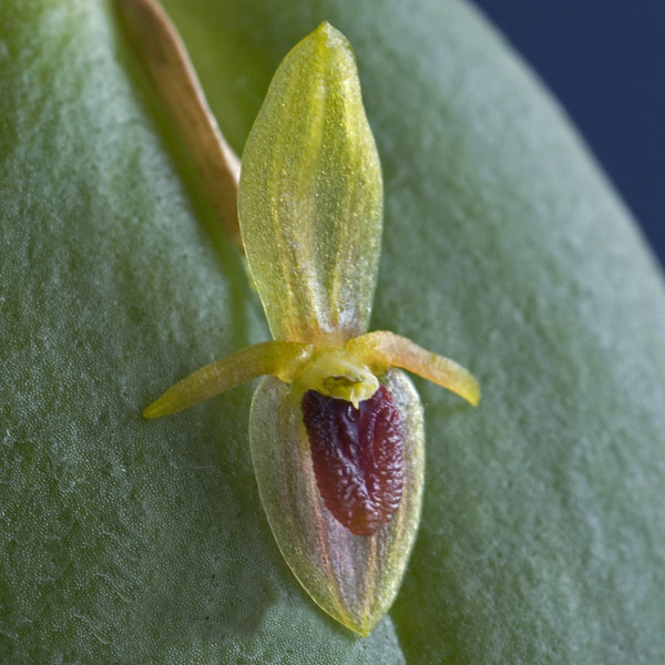 An Ecuadorian, small sized, warm to cold growing epiphytic species from elevations of 1500 to 3000 meters with slender, erect ramicauls enveloped basally by 2 to 3 tubular sheaths and carrying a single, apical, spreading, rigidly coriaceous, avate, acute, basally sessile and cordate leaf that blooms on a fascile of successive single flowered, short inflorescence arising through a spathe at hte leaf base and has a thin, tubular floral bract.