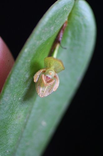 Found in Ecuador at elevations around 1200 to 2000 meters as a small sized, warm to cool growing epiphyte with erect, slender ramicauls enveloped by a close, tubular sheath below the middle and 2 to 3 others at the base and carrying a single, apical, suberect to spreading, coriaceous, ovate, acute, slightly acuminate, sessile and shallowly cordate base leaf that blooms in the summer on a succession of single flowered, racemose inflorescence arising through a spathe and has thin tubular floral bracts.