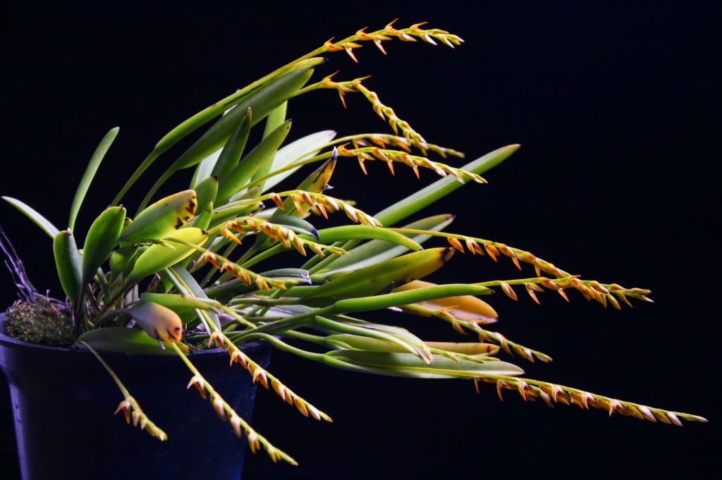 Found in southeastern to southern Brazil on rough mossy bark in primary forests at elevations of 1300 meters as a miniature to small sized, warm to cool growing epiphyte with an erect ramicaul carrying a single apical, erect, coriaceous, oblanceolate, acute, gradually narrowing below into the stout, petiolate base leaf that blooms in the spring through fall on 2 to 3 at once, racemose, 2.4" [6 cm] long, 4 to 9 flowered inflorescence arising from the apex of the ramicaul and can bloom for several years with new inflorescence from the same ramicaul and carrying fragrant flowers.