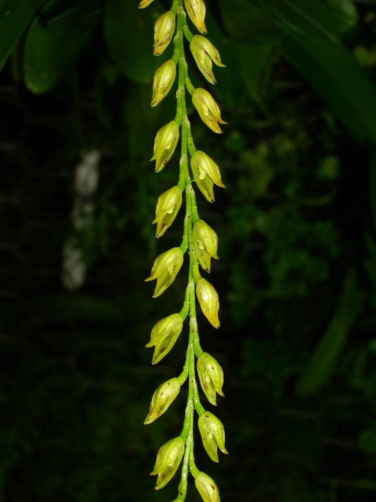 Found in southwestern Colombia and Ecuador in scrub cloud forests at elevations around 1400 to 3000 meters as a small sized, warm to cold growing epiphyte with an erect ramicaul enveloped by 2 sheaths and carrying a single, apical, erect, ligulate, obtuse, shortly bilobed apically, narrowing below into the subpetiolate base leaf that blooms in the spring and summer on a single, erect, 7.2" [18 cm] long, subdensely many flowered inflorescence with cucullate-ovate, shortly acuminate flroal bracts.