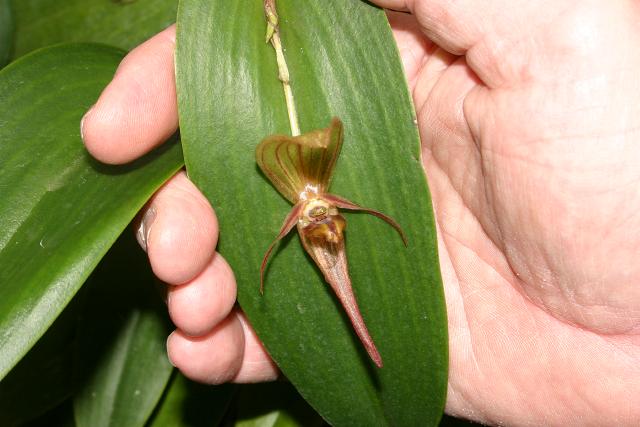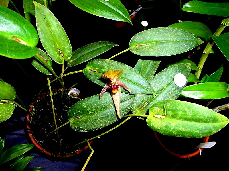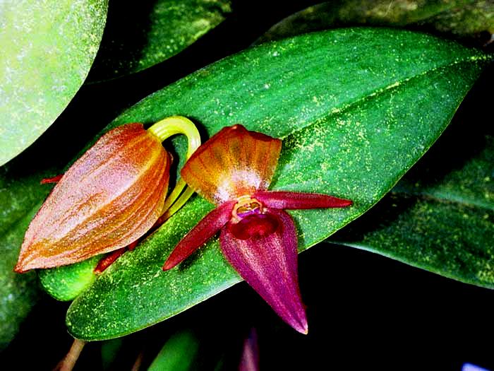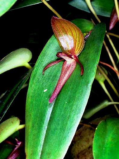 Found in Venezuela, Colombia, Ecuador, Peru and Bolivia in montane forests at elevations of 1100 to 3300 meters as a small sized, cool to cold growing epiphyte with erect, slender ramicauls enveloped basally by 3 tubular sheaths and carrying a single, apical, cordate, apically tridentate leaf that blooms in the summer and fall on a single flowered, short inflorescence holding the flower against the leaf base.